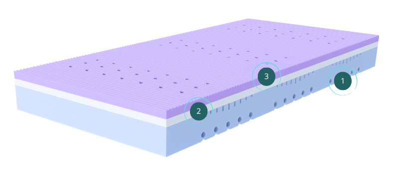 Materac oferuje dwie strony o różnej twardości (H2 i H3), co pozwala na dostosowanie poziomu komfortu do indywidualnych preferencji użytkownika. Pianka fioletowa HR (35 kg/m3) + pianka termoelastyczna VISCO tworzą stronę materaca o twardości H2. Pianka błękitna PUR (35 kg/m3) tworzy stronę materaca o twardości H3.