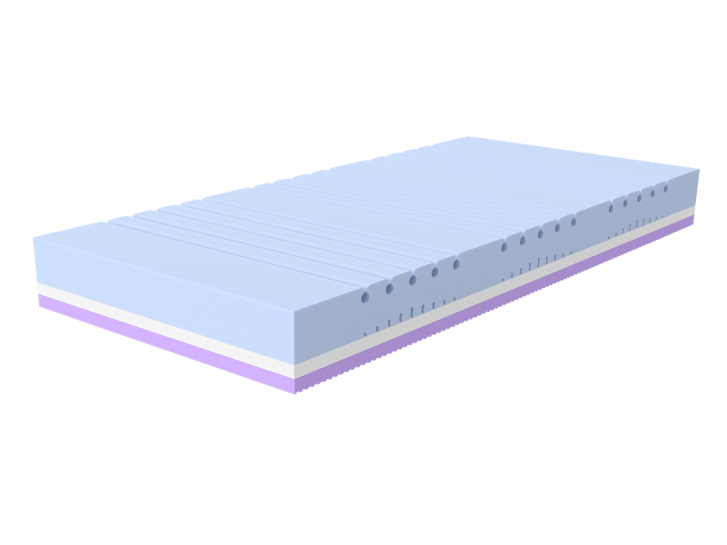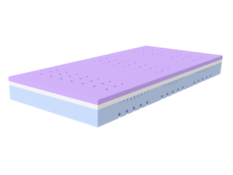Materac oferuje dwie strony o różnej twardości (H2 i H3), co pozwala na dostosowanie poziomu komfortu do indywidualnych preferencji użytkownika. Pianka fioletowa HR (35 kg/m3) + pianka termoelastyczna VISCO tworzą stronę materaca o twardości H2. Pianka błękitna PUR (35 kg/m3) tworzy stronę materaca o twardości H3.